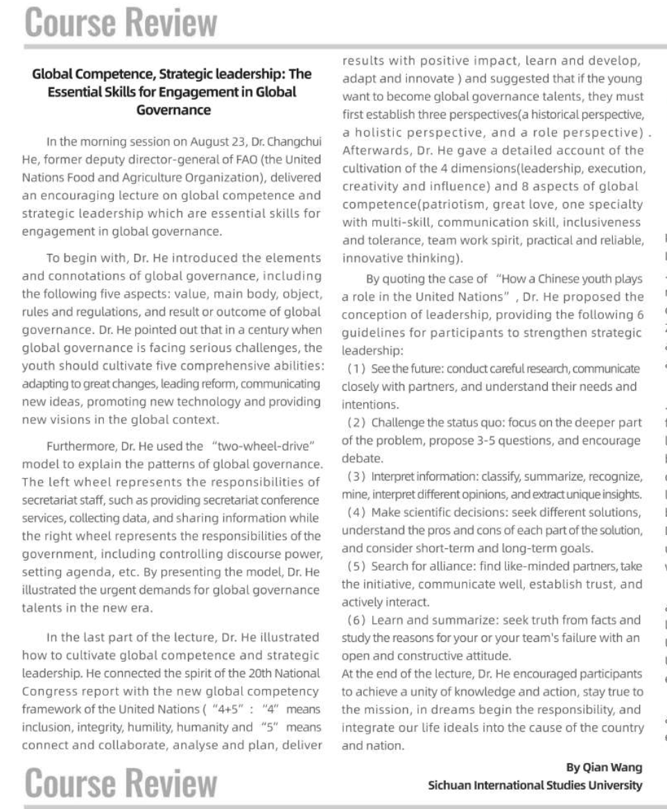 据悉,联合国青年领袖精英班(Global Youth Leadership Academy, GYLA)成立于2016年,是国内领先的国际化青年专业人才启智平台,致力于培养未来全球青年领袖、国际组织人才和跨文化专业人才。我校在新文科教育教学改革中,注重培养学生的家国情怀和国际视野,自2020年起连续三年组织学生参加了GYLA精英班。他们凭借出色的外语能力和过硬的综合素质,多次荣获精英班“优秀学员”“杰出贡献奖”等荣誉称号。在本次GYLA公益精英班的学习中,川外学子表现同样亮眼,多次用英文撰写高质量稿件投稿GYLA官方刊物并获发表,赢得了国际组织官员和专家教授的高度肯定。