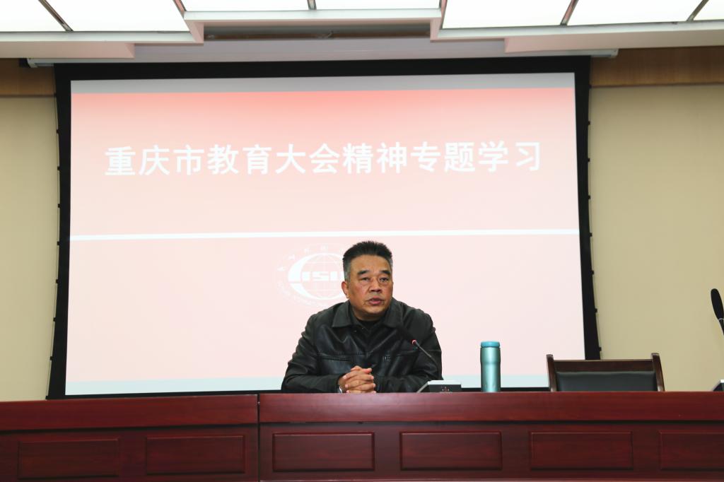 12月11日下午,我校召开会议专题学习重庆市教育大会精神。全体在家校领导、各部门负责人、各教学单位党政主要负责人及各直属党支部负责人参加会议。党委书记明国辉作传达学习。