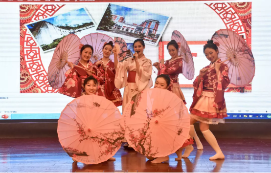 校团委书记丁欢带领川外大学生艺术团为年会送上了经典舞蹈节目《樱花飞舞》,让大家看到了新时代的新气象。