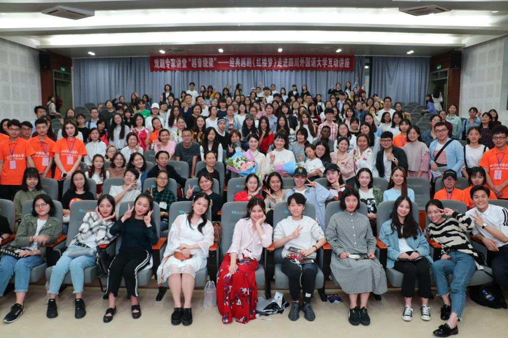2018年4月10日19时,由上海越剧院、重庆市戏剧家协会、四川外国语大学共同主办,四川外国语大学非物质文化遗产推广基地承办的戏剧专家讲堂“越音绕梁”——经典越剧《红楼梦》走进四川外国语大学互动讲座活动在西区教学楼A栋报告厅举行。讲座由四川外国语大学非物质文化遗产推广基地成员刘丽平同学主持。校工会副主席、女工委主任张琴老师,中文系党总支书记卢玫老师,校团委书记丁欢老师与同学们共同聆听了讲座。