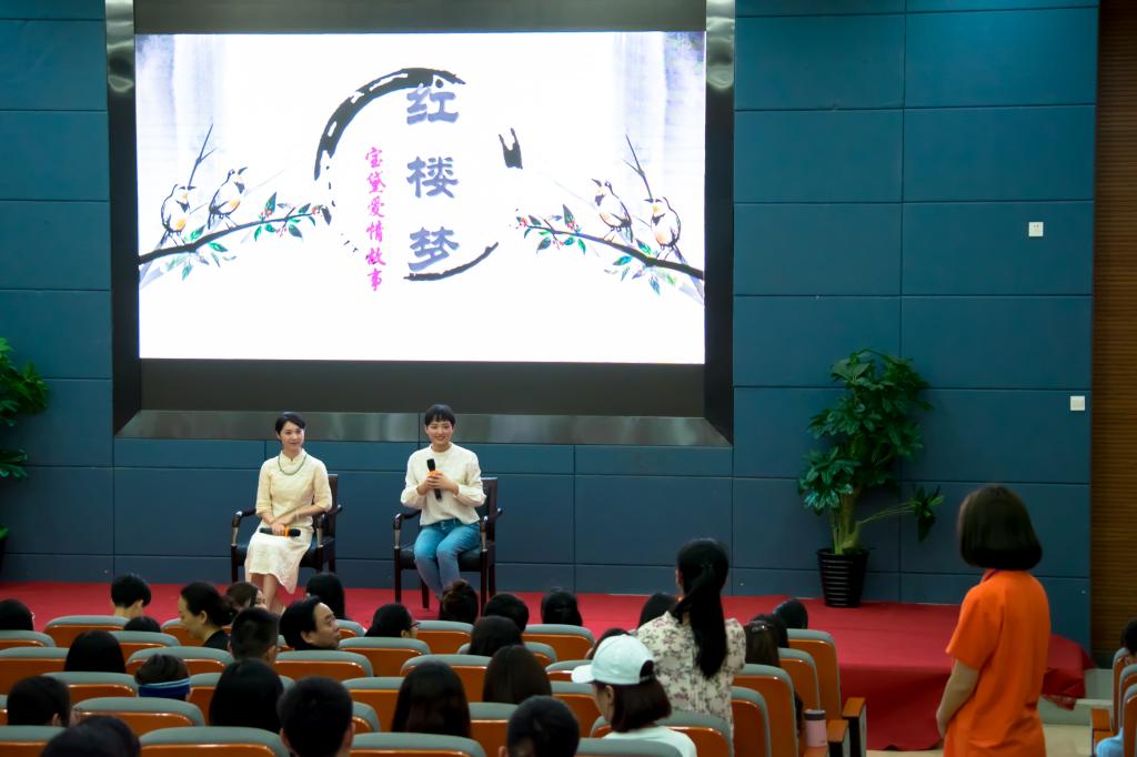 本次讲座以“越音绕梁”为主题,以“宝黛爱情故事”为主线,上海越剧院王派花旦、青春版《红楼梦》林黛玉饰演者李旭丹,青年演员工小生、贾宝玉饰演者王婉娜与现场师生一起分享了戏曲艺术的魅力。两位分享嘉宾从自己对《红楼梦》的角色塑造、越剧传承等方面畅谈心得体会,并带来了越剧《红楼梦》的视频片段。她们还现场演绎了越剧《红楼梦》中的经典唱段“宝黛初见”、 “黛玉葬花”,并与观众进行了互动和现场教学,为表现优秀的同学送上了印有“宝黛”卡通头像的T恤和精美书签。