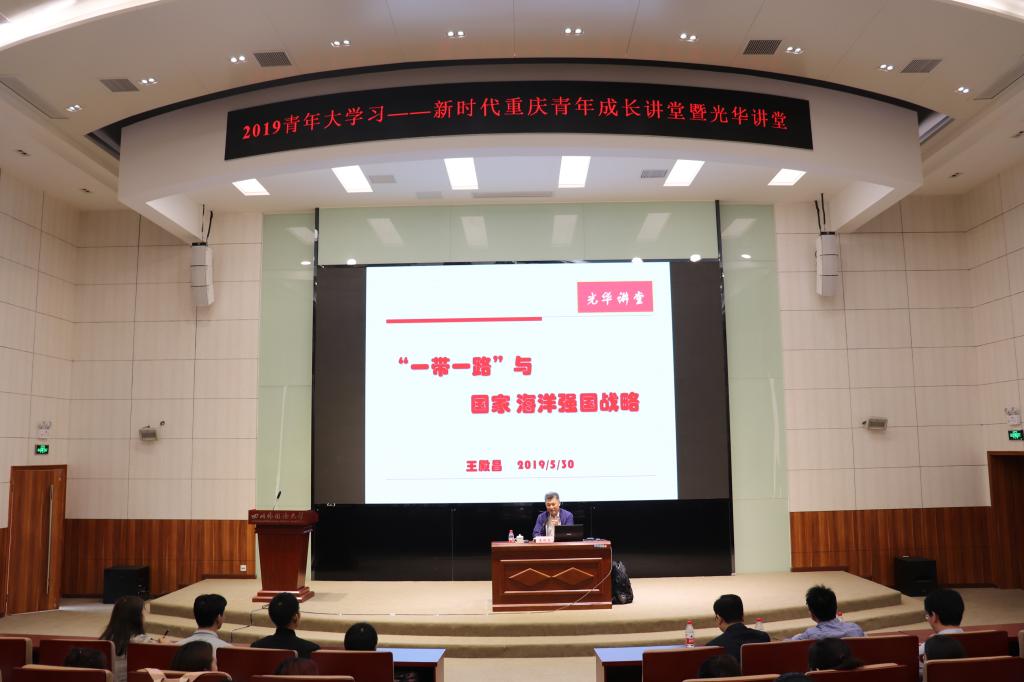 光华研究院首席专家、国家海洋局政策法规和规划司原司长王殿昌,重庆市团校党委书记、校长涂凯,重庆市团校党委委员、副校长唐树森,四川外国语大学党委常委、副校长祝朝伟出席活动。我校团学干部、团员青年、学生代表、青年教师共计200余人参加活动。