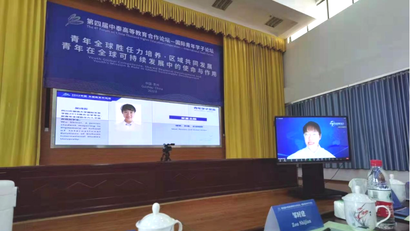 “第四届中泰高等教育合作论坛-国际青年学子论坛”是由中国外交部、中国教育部、贵州省人民政府共同主办,贵州省教育厅、贵州省外事办公室联合承办的“2022中国-东盟教育交流周”主要活动之一。本次论坛由江苏大学、贵州大学、中泰高等教育合作联盟共同主办,以“青年全球胜任力培养、区域共同发展、青年在全球可持续发展中的使命与应用”为主题,采用线上线下结合的形式在贵阳学院举行。来自华东师范大学、江苏大学、安徽大学、四川外国语大学、西安外国语大学、贵阳学院、泰国加拉信大学等十余所高校的中外专家、教师、学生等300余人参加论坛。