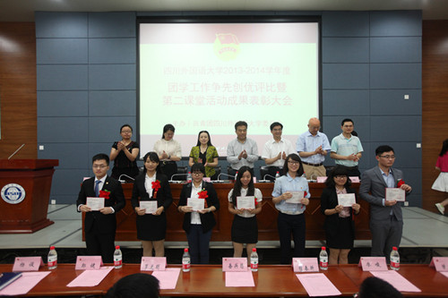2014年6月6日下午,四川外国语大学2013-2014学年度团学工作争先创优评比暨第二课堂活动成果表彰大会在西区教学楼a栋报告厅召开。校党委书记明国辉、校长李克勇、校党委副书记雷莹、副校长李小川等校领导出席大会。参加大会的还有校党政办公室主任张季菁、校党委宣传统战部副部长黄科等职能部门负责人,以及各二级学院(系、部)党总支、团总支书记代表。校团委书记丁欢主持大会。