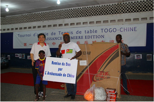 当日,中国驻多哥大使刘豫锡与多哥乒乓球协会主席洛科·科尤也现场展示了直横板的不同球风球技。同时,中国驻多哥使馆为多哥乒协捐赠了球桌、球拍等乒乓器材,多哥华联会也为多哥乒协的两名学员捐赠了助学金。