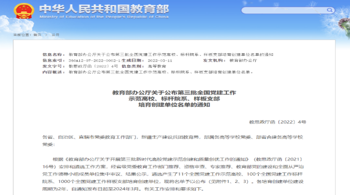 近日,教育部办公厅公布第三批全国党建工作示范高校、标杆院系、样板支部培育创建单位名单,我校商务英语学院学生第二党支部入选“全国党建工作样板支部”培育创建单位。