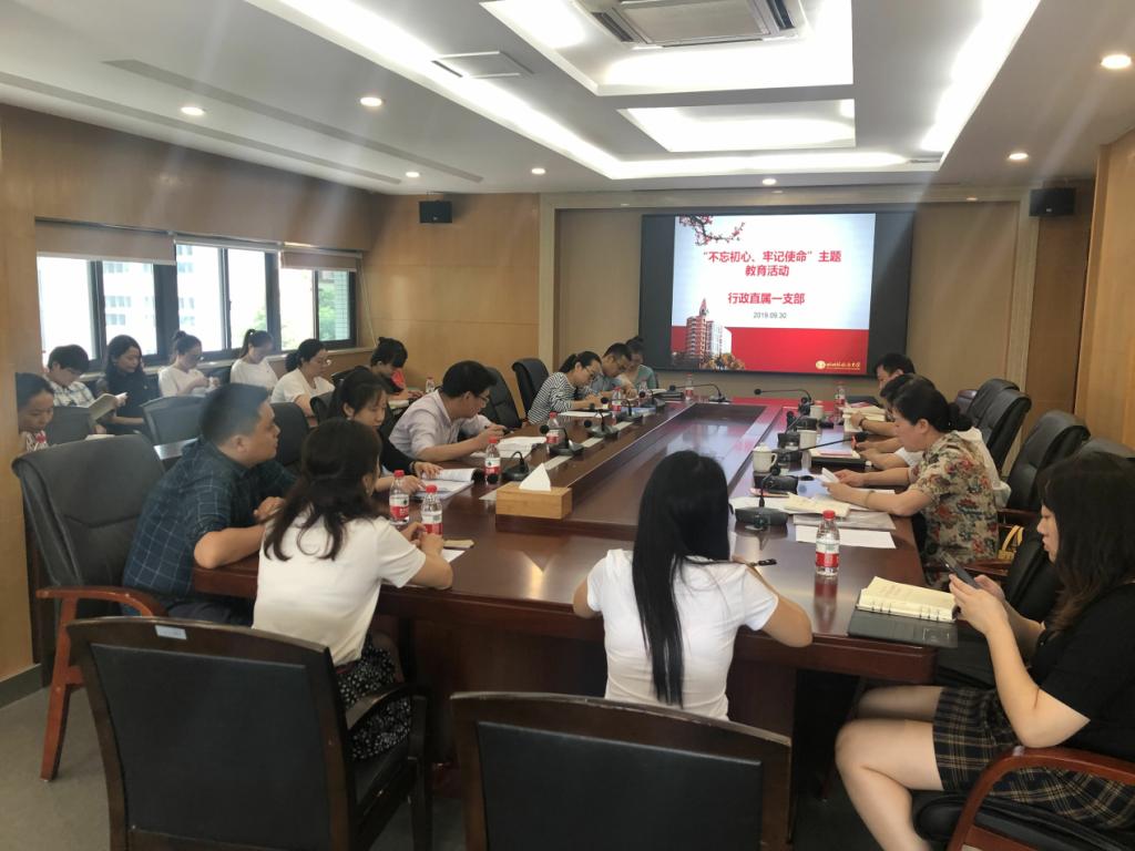 为进一步强化党组织政治功能,提升组织力,加强党史党纪教育,激发党员干部坚定理想信念,深入贯彻落实党的十九大精神。2019年9月30日,行政直属一支部在综合办公楼A栋301开展了“不忘初心、牢记使命”主题教育。党委副书记、校长李克勇,行政直属一支部书记周正容及支部党员参加了此次活动。