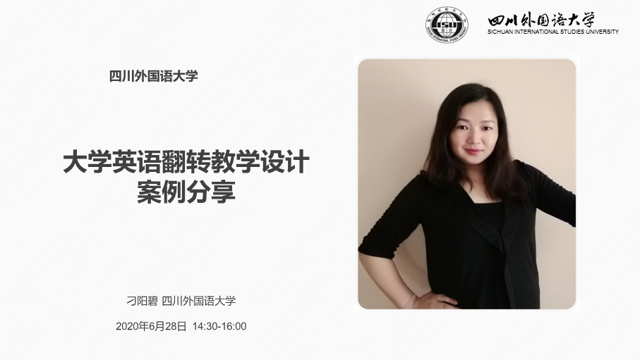 2020年6月,重庆市大研会和高教社共同推出“线上线下深度融合,打造大学外语教学的‘新常态’系列讲座”,大外部英语教师刁阳碧应邀担任该系列讲座第二场的主讲讲师。6月28日下午14:30至16:00讲座在昭信在线平台如期举行。本场讲座由高教社谭钦文老师担任主持,他简单介绍了川外大外部翻转教学情况后,刁阳碧老师正式开始主讲。