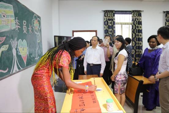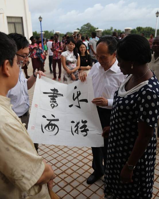 洛美大学孔子学院汇报了学院工作情况。学生代表张开以“有朋自远方来”作为开幕词,阐述了“一带一路”倡议,描述了孔子学院“开汉字教学之先河”的成果。他流利、地道的汉语和对中国政治、文化的了解令来访嘉宾夸赞不已。学生们还表演了精彩的孔雀舞,声情并茂地朗诵了《沁园春·长沙》。