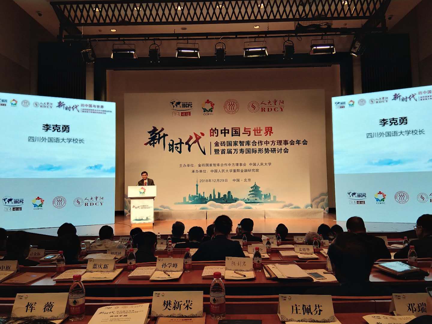 2018年12月29日,金砖国家智库合作中方理事会年会暨首届万寿国际形势研讨会在北京举行。本次年会由金砖国家智库合作中方理事会和中国人民大学主办,重阳金融研究院承办,国内90家理事单位派员参加。李克勇校长作为副理事长应邀参加了会议。金砖国家研究院朱天祥博士、张庆博士、谌华侨博士一同前往。