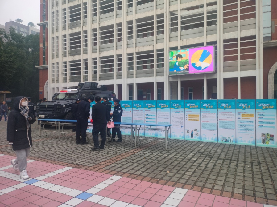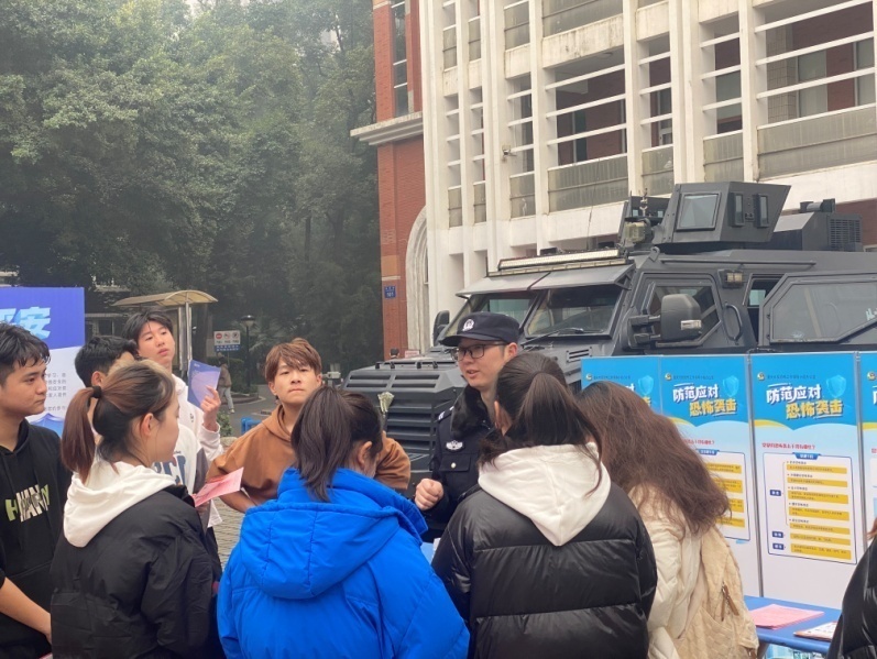 为进一步贯彻落实习近平总书记关于反恐怖工作的重要指示精神,加强学校师生反恐怖防范意识和自我保护能力,增强应对突发恐怖事件能力,积极创建和谐、平安校园,2023年12月28日,学校保卫处联合沙坪坝区公安分局反恐支队、沙坪坝区公安分局特警支队、沙坪坝区公安分局童家桥派出所在东区月亮广场开展了反恐怖宣传教育活动。
