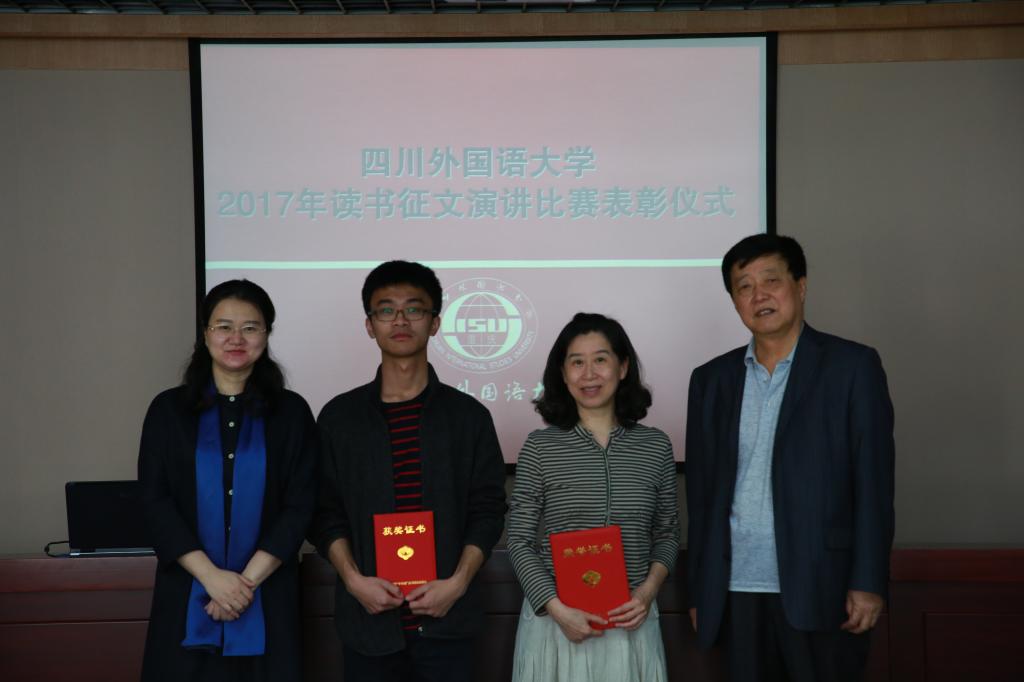 学校党委学生工作部部长、学生处处长吴维均宣读四川外国语大学关于对2017年开展“中华魂”(辉煌与梦想)读书征文演讲活动获奖学生、指导老师和优秀组织单位表彰的决定。学校党委常委,副校长张季菁等领导向获奖人员和单位颁发了获奖证书和奖金。