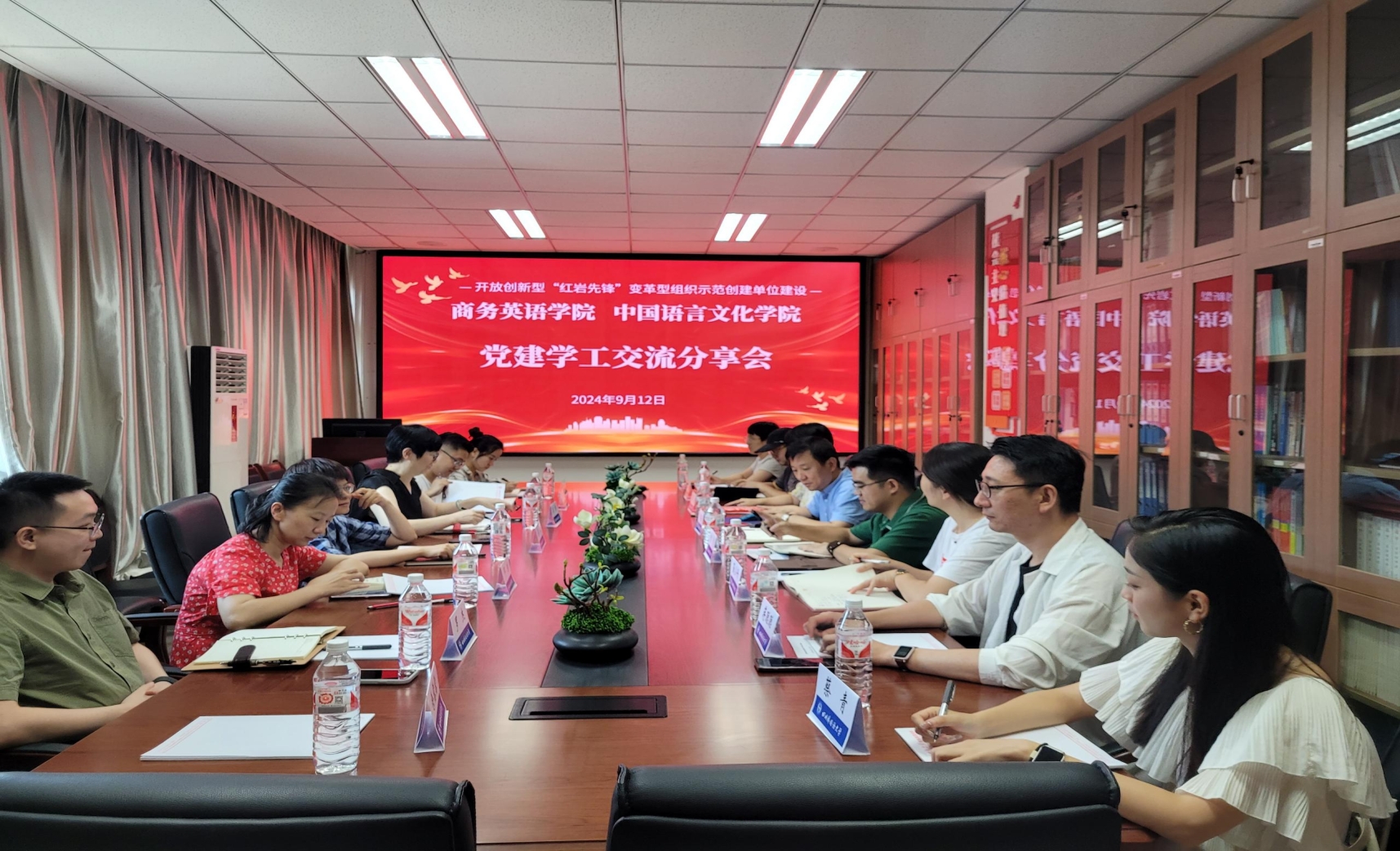 为进一步做好联合申报的学校首批开放创新型“红岩先锋”变革型组织示范创建单位建设,9月12日下午,商务英语学院与中国语言文化学院共同开展了党建学工交流会。中国语言文化学院党总支书记薛红、党总支副书记李铮,团总支书记陈茁,本科及研究生辅导员一行7人参加党建学工经验交流。商务英语学院党总支书记常慧明、团总支书记曾贵、本科及研究生各年级辅导员参与交流活动。会议由学院党总支书记常慧明主持,本次交流会旨在加强两院间在党建工作和学生工作方面的经验分享与合作,共同探讨新时代背景下高校党建与学生工作的新思路、新方法。