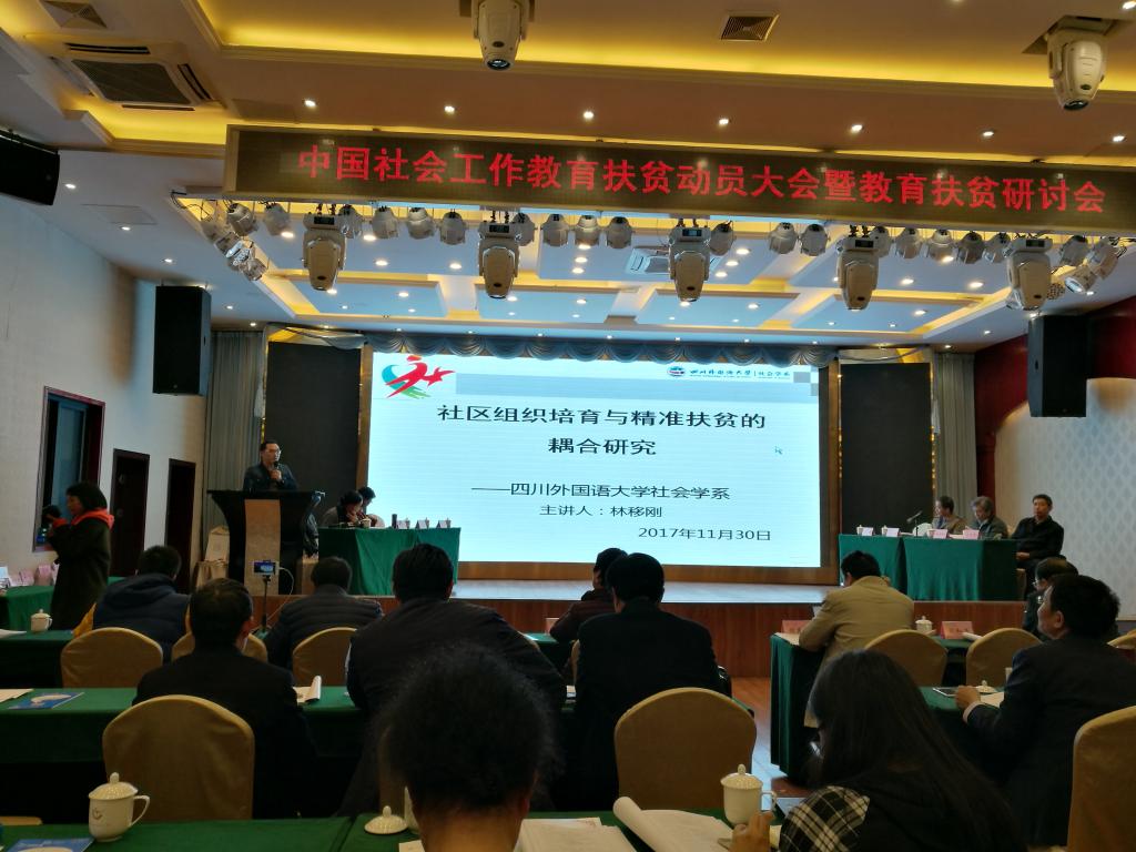 中国社会工作教育扶贫动员大会暨教育扶贫研讨会于2017年12月1-3日在成都举办。会议由全国社会工作专业研究生教育指导委员会、中国社会工作教育协会主办,西华大学社会发展学院承办,北京大学-香港理工大学中国社会工作研究中心协办。协会会长徐永祥、民政部社会组织管理局副局长吕晓莉等领导作工作动员讲话。我校林移刚教授、田金娜博士和穆丽萍老师应邀出席大会,林移刚在大会上做了题为“贫困村(社区)自治组织培育与精准扶贫的耦合模式研究”的主题发言。会上,我校被选为中国社会工作教育协会反贫困社会工作委员会成员,顺利入选“中国社会工作教育百校扶贫对口扶贫计划”单位,对口实施项目点是重庆市城口县。