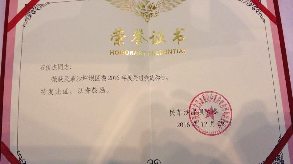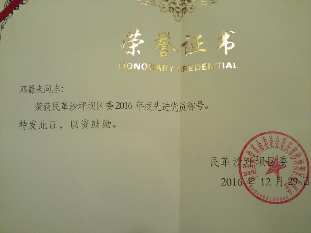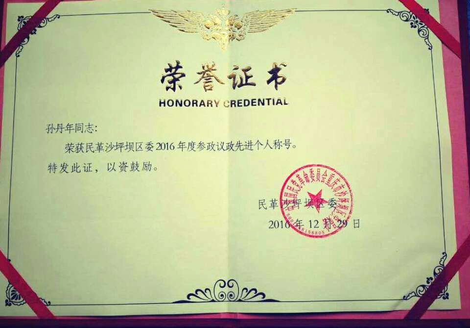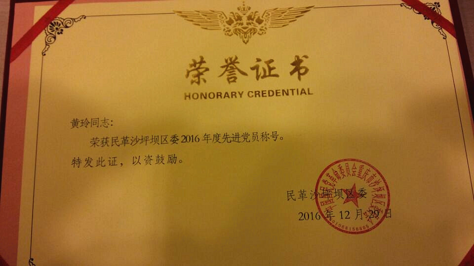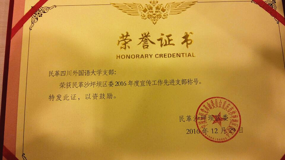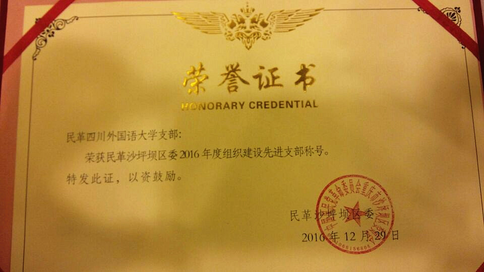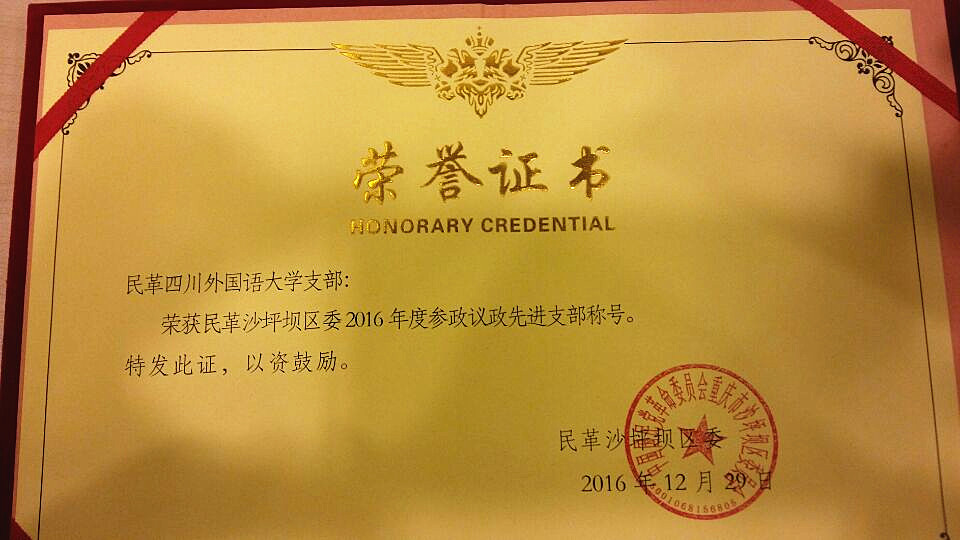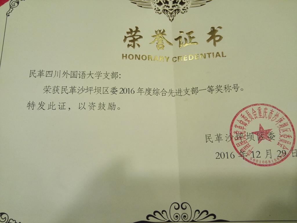 继2015年获得民革区委多个奖项后,民革川外支部在2016年再次荣获了2016年度民革区委颁发的“先进支部一等奖”;荣获“组织建设先进支部”、“参政议政先进支部”、“宣传工作先进支部”等多个单项奖;黄玲获民革重庆市委“祖统工作先进个人”的荣誉;邓蜀来、石俊杰和黄玲三位党员荣获2016年民革区委“先进党员”称号;孙丹年、黄玲获区委“参政议政先进个人”荣誉。