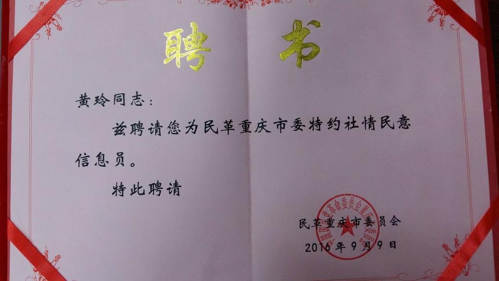 黄玲被聘为民革重庆市委特约社情民意信息员