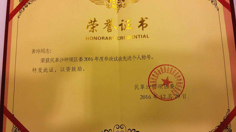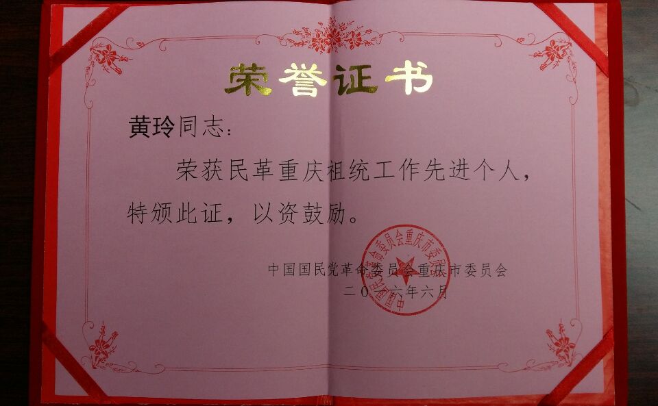 黄玲荣获民革重庆祖统工作先进个人