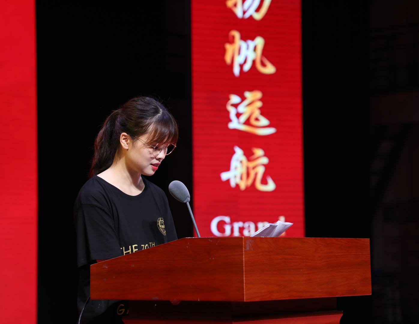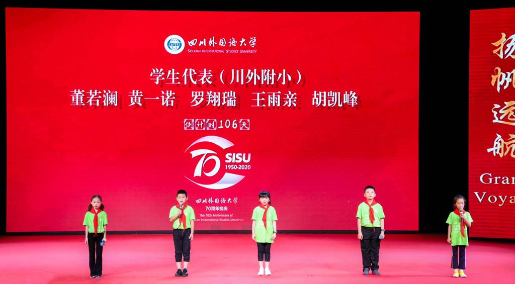 紧接着,我校国际文化交流大学生艺术团学生团长、第六届研究生支教团成员李梦作为学生代表发言。作为毕业生的李梦说到,虽然因不能赶上为母校庆生而遗憾,但仍为成为校庆晚会筹备工作组中的一员而感到幸福。李梦代表所有参与演出的川外学子表态:一定会服从学校安排,听从老师指挥,严守纪律,刻苦训练,好好照顾自己,圆满完成任务;此外,来自四川外国语大学附属小学的小演员代表们也举起右手,向所有到场的老师同学敬礼,表态到一定会努力学习、刻苦训练,听老师的话,为校庆加油。