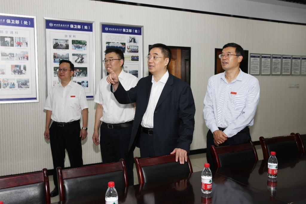 9月30日上午,市委教育工委书记、教委主任刘宴兵,市教委安稳办主任肖东一行来我校检查节前安全稳定工作,并慰问我校师生。我校党委书记邹渝、校长董洪川、副校长祝朝伟及党政办、党委学工部、党委保卫部、国际合作与交流处和后勤基建管理处相关负责人陪同走访检查。
