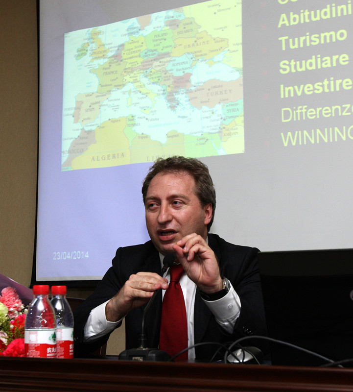 会见结束后,马非同总领事一行前往校图书馆208会议室为我校意大利语专业的师生们做题为“了解意大利”的专题讲座。面对即将成为连接中国与意大利“桥梁”的同学们,马非同总领事表示希望通过本次讲座让大家更全面地了解意大利。他从意大利的地理、人口、语言、风土人情谈起,对意大利的服装业、工业、手工业等举世闻名的产业等做出简单介绍;他谈到中意两国的相似性与差异性,其中不乏马非同总领事本人在中国的有趣见闻;针对大部分同学关心的赴意大利留学问题,马非同总领事也作了详细介绍。整场讲座,马非同总领事以他幽默的语言和流利的汉语赢得了在场师生的称赞,现场掌声阵阵,气氛轻松融洽,同学们纷纷表示受益匪浅。