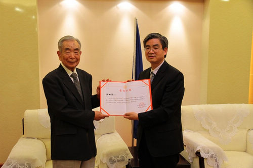 随后,李克勇校长亲自向福田繁先生颁发了“荣誉教师”证书。