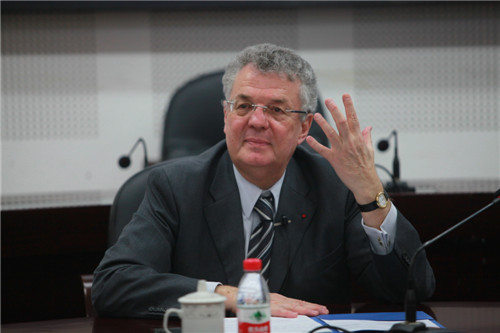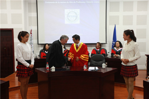 a2-1会议室以《法语:一门语言;一项制度;一种使命》为主题发表演讲,并与师生进行交流。讲座后,李克勇校长向赛伯乐主席颁发聘书,聘请他为我校名誉教授。