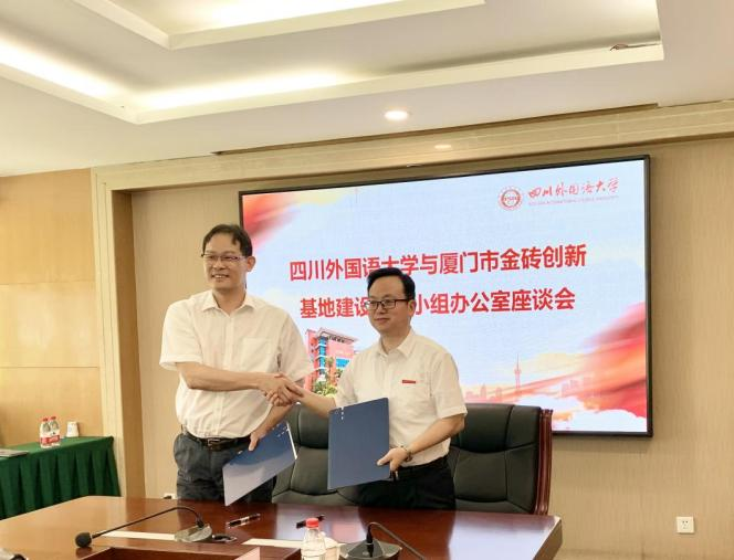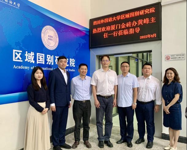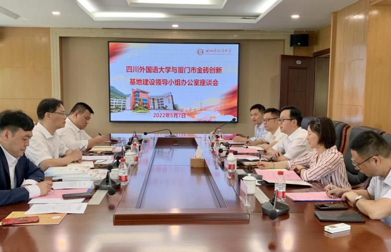 2022年5月7日,厦门市金砖创新基地建设领导小组办公室一行访问川外并与我校签署战略合作协议。厦门市金砖办常务副主任黄峰、政策协调组副组长黄玉玲、政策协调组干部杨帆,四川外国语大学副校长祝朝伟、校地合作处处长蒋晓丽、国际合作与交流处副处长朱天祥、科研处综合科科长谢运龙、区域国别研究院执行院长陈广猛参与座谈。