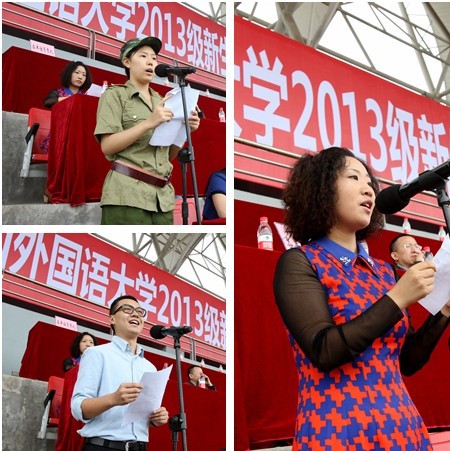 随后,德语系刘哲宇同学代表在校学生发言,他以一个学长的身份向所有2013级本科新生致以问候和欢迎。接着,他列举了学校内的各种社团、活动、比赛,为学弟学妹们勾勒出一幅丰富多彩的大学生活画卷。在鼓励他们多参加活动,投身公益事业丰富生活的同时,刘哲宇同学也建议新生珍惜时间用心读书,懂得大学之道,在宝贵的年华中绽放光彩。