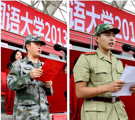 2013级军训学员代表、日语系的王亚伟同学代表全体新生郑重承诺:将服从指挥,严格要求自己,走出父母依偎,褪去稚气,在军训中磨砺意志,为青春留下不悔一页。