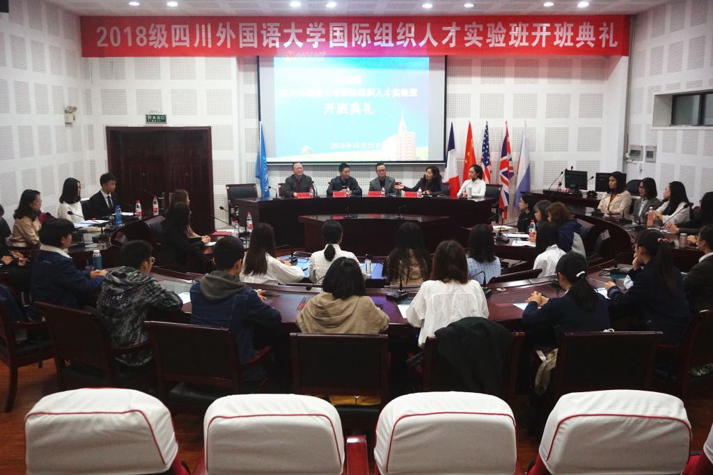2018年10月25日下午,四川外国语大学国际关系学院2018级国际组织人才实验班开班典礼在我校西区教学楼A2-1顺利召开。四川外国语大学副校长祝朝伟、教务处副处长陈汝平、国际关系学院院长刘玉梅、国际关系学院党总支书记高绍邦及部分教师代表出席了此次典礼,参加此次典礼的还有来自2018级“3+1”国际组织人才实验班的全体同学。