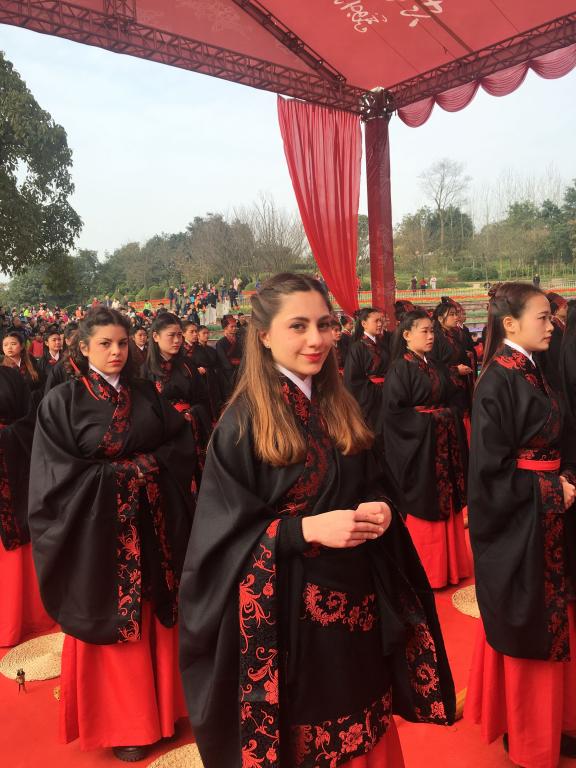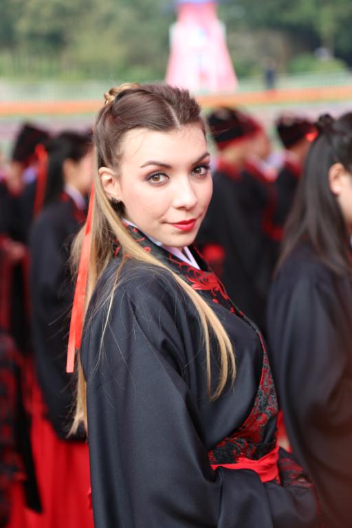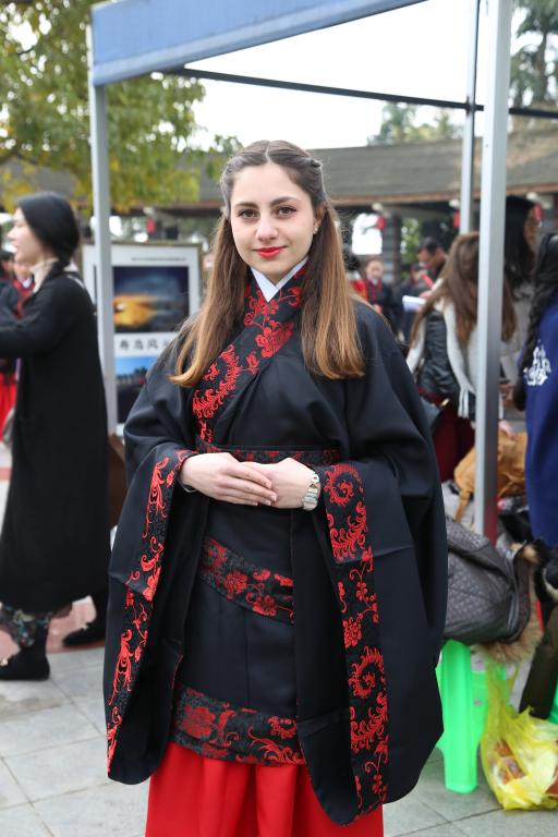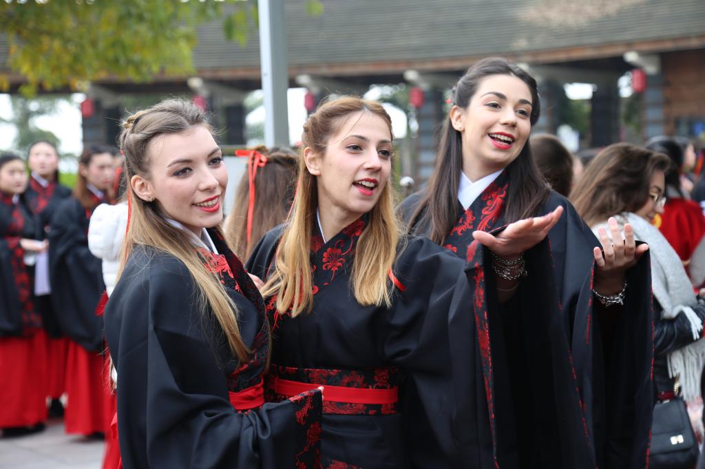 一大早,我校随行记者就在现场看到,在100名参与者中,我校18位金发碧眼的留学生格外引人注目,她们挽着优雅的发髻,系着长长的束带,穿着庄重的汉服,优雅而端庄,引来游客们赞叹不已,并争相与她们合影。