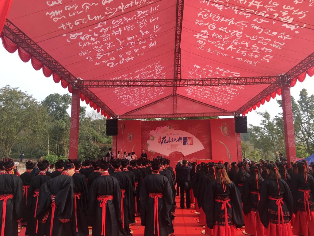 狮子滩下泥城坝,长寿湖畔又飞花。伴随着朗朗书声与悠悠花香,3月18日上午,在长寿湖郁金香阶梯花田和露天演艺场,100名中外青年学子身穿汉式彩衣行献花香礼、成人礼等中华传统礼仪,亲身体验了中华传统文化的庄重感和仪式感,再现古时花朝节盛况。