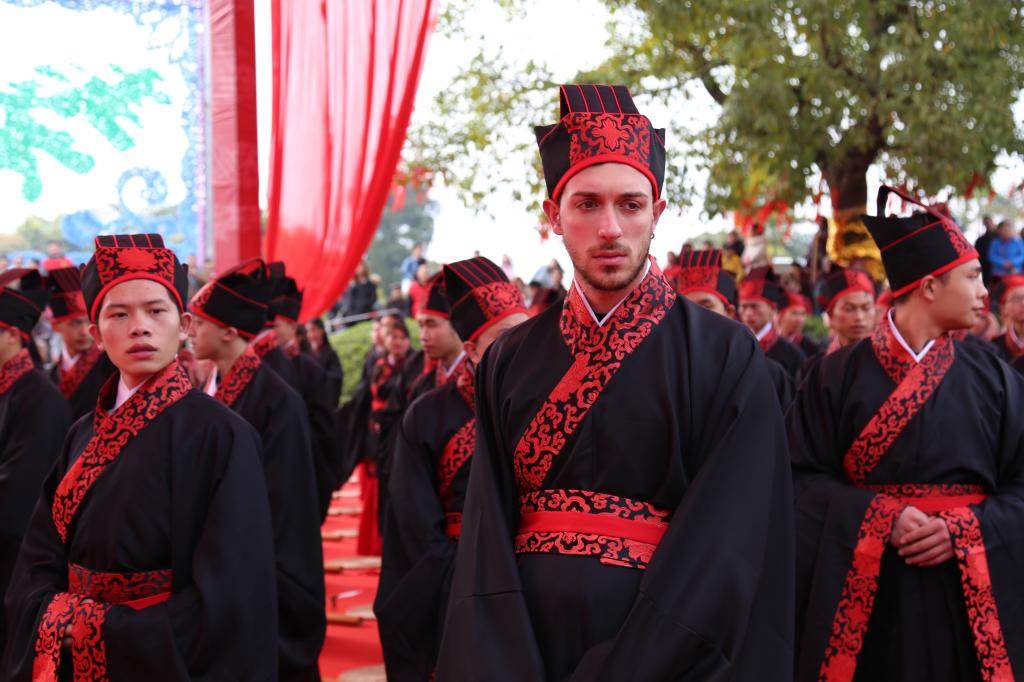随后,100名中外青年学子依次进行盥洗、加笄加冠、醴礼、三拜、宣誓、师长聆讯、吟诵环节,举行充满仪式感的汉式成人礼。特别是三拜礼中,笄者和冠者要分别拜谢父母,感念父母养育之恩;拜谢师长,感悟师恩浩荡,沐浴成长教诲;拜谢轩辕黄帝,传承文明以报人文祖恩,让参与者切实体会到“先做人,后学艺”的中华千年传统文化的理念。