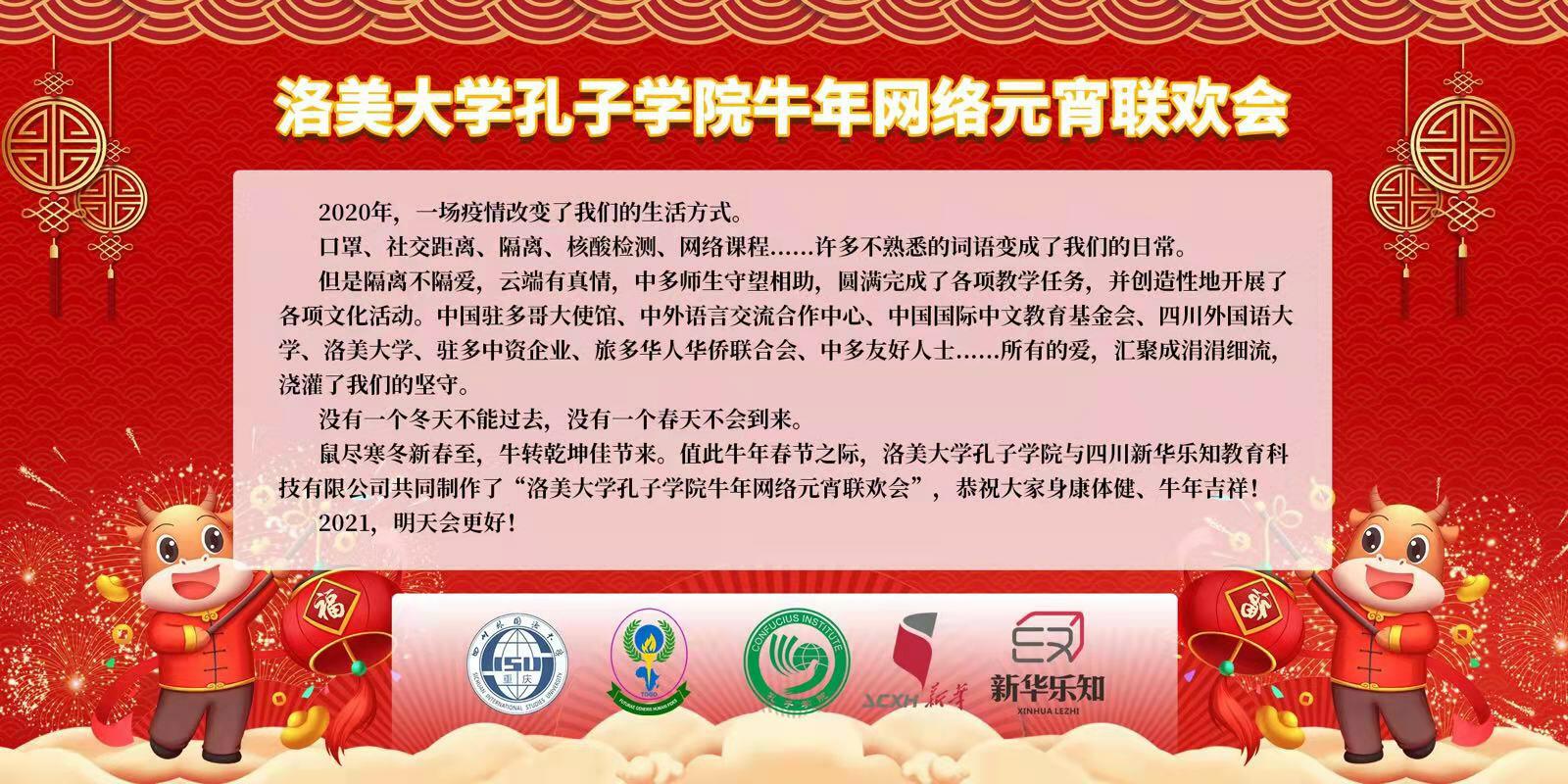 2月26日,由洛美大学孔子学院与四川新华出版发行集团联合主办,四川新华乐知教育科技有限公司承办的“2021魅力汉语-多哥”线上元宵联欢会成功举办。