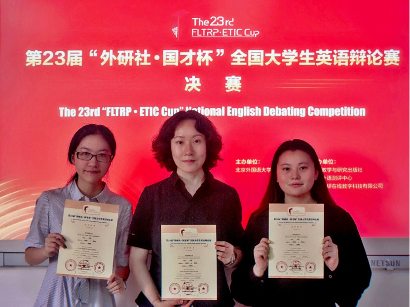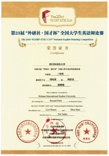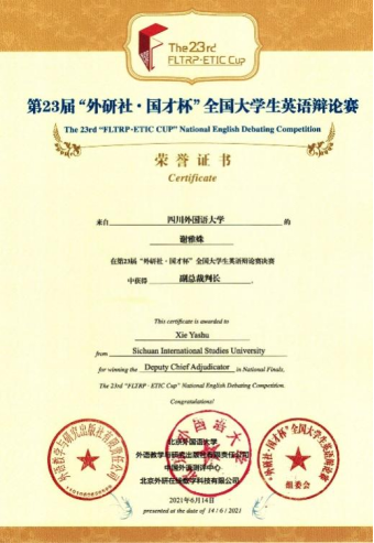 2021年6月14日上午,由北京外国语大学主办,外语教学与研究出版社、中国外语测评中心、北京外研在线数字科技有限公司承办的第二十三届“外研社·国才杯”全国大学生英语辩论赛总决赛落下帷幕。我校英语学院辩手刘纯溪、周思佳在指导老师谢雅姝的带领下,以出色的表现荣获全国总决赛二等奖,续写了四川外国语大学辩论队在大型英语辩论赛中的辉煌成绩。指导老师谢雅姝受邀担任了本届赛事的副总裁判长。