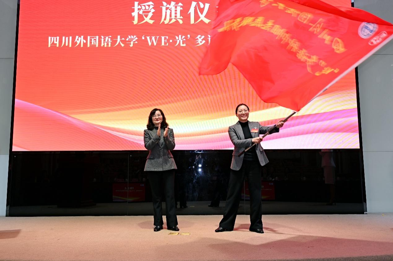 臧秀梅为新成立的“四川外国语大学‘WE·光’多语种巾帼志愿服务队”授旗。