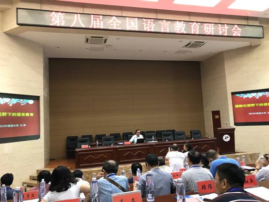 开幕式之后进行大会发言。四川外国语大学王寅教授、清华大学外文系崔刚教授、华东政法大学外语学院院长屈文生教授、华东师范大学言语听觉科学教育部重点实验室主任黄昭鸣教授、北京语言大学语言康复学院院长高立群教授、北京航空航天大学向明友教授、广东省外语艺术职业学院院长曾用强教授、蓝鸽集团张新华董事长、广东外语外贸大学卢植教授、四川外国语大学教务处副处长姜孟教授等分别作了题为“国际化视野下的语言教育”、“外语教学理论中国学派的建设”、“法律翻译与中西法律交流:翻译研究与教学的一个面向”、“我国语言康复教育之路:历史、现实与前瞻”、“语言教育与语言治疗联系”、“我的教学科研观:语法教学个案”、“中国英语能力等级“阅读量表”的制作原则与方法”、“智慧校园环境下的外语教学思路浅谈”、“论外语教育改革背景下培养创新型外语人才的制度建设”、“基于脑认知神经实验室的语言基础研究与语言病理学研究”的大会发言。