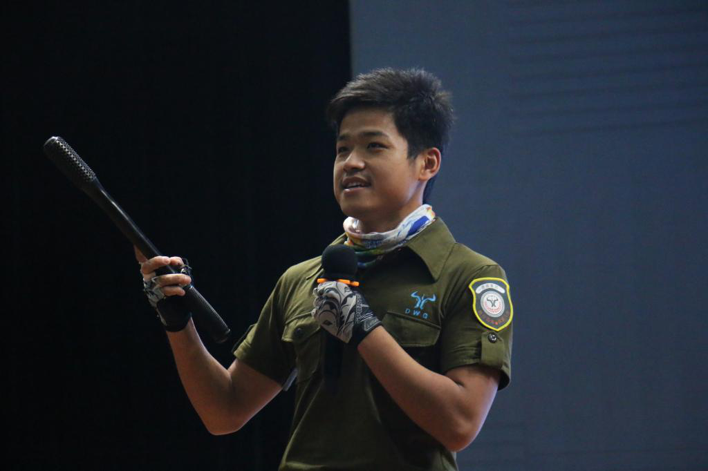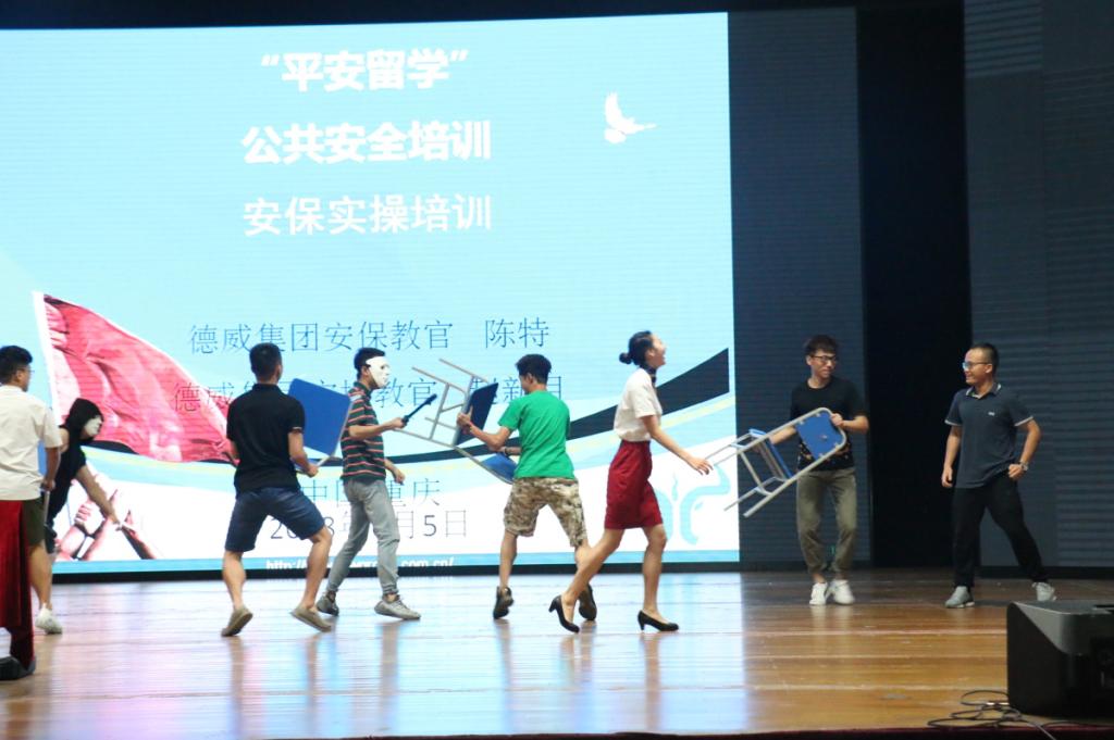 随后,德威集团的两位教官对现场人员进行了安保实操培训。赵新月实操教官分析了留学生在外可能遇到的险情,对现场人员进行了简短的反应能力训练;陈特安保教官则亲身下台为现场学生们模拟了突发性事件的发生过程,示范讲解了应对方法,并邀请部分学生上台互动演练。培训会现场人员积极配合,气氛活跃。