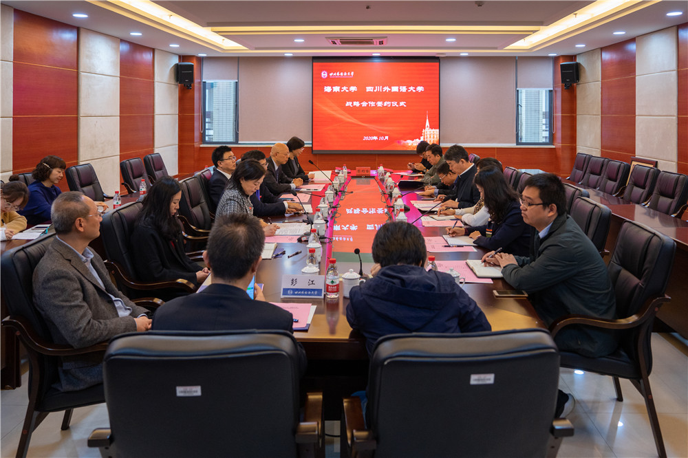 10月19日,四川外国语大学与海南大学战略合作框架协议签约仪式在四川外国语大学举行。海南大学校党委书记武耀廷、党委常委王崇敏、党委办公室主任林洪冰、人事处处长聂清斌、外国语学院副书记刘雨芙、党委办公室秘书科科长黎雨苗、委办公室综治科科长王动动,四川外国语大学党委书记邹渝、校长董洪川、副校长李小川、副校长苟朝莉以及相关职能部门负责人参加仪式。苟朝莉主持仪式。