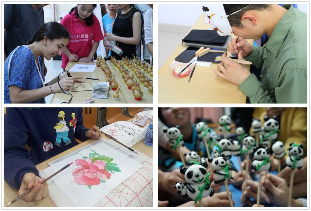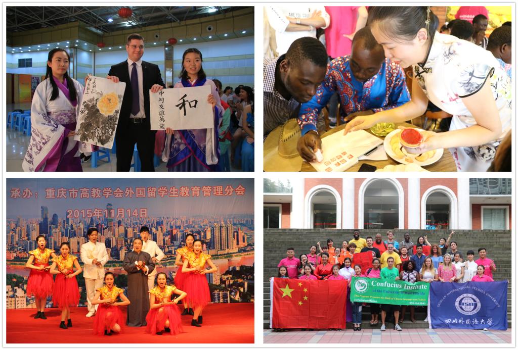构建中外人文交流传播路径,让中华优秀传统文化的影响“亮”起来。学校深入挖掘代表中华文化的特色元素,擦亮文化走出去的名片。2014、2015年,受国家汉办委派,以非遗基地师生为核心力量赴俄罗斯进行传统文化巡演,内容包括剪纸、茶道、书法技艺展示,金钱板、古琴、民族服饰、民族歌舞表演等,访问7座城市和9所学校。巡演获俄罗斯电视台、国家汉办网站、新华社亚欧分社等主流媒体报道,中华人民共和国驻俄罗斯联邦大使馆参赞赵成国亲切慰问和热烈表扬参与师生,相关内容刊载于教育部中俄人文合作委员会第168期简报。3名喀山联邦大学俄罗斯青年通过体验参与文化巡演,受到中华传统优秀文化感召,改变原意大利留学计划到中国留学。注重传播中艺术形式、表现技法与思想理念、人文观念结合并重,实现“以文载道”、“寓教于乐”,使参与者在体验中华传统文化“有意思”基础上领悟到“有意义”。在重庆市首届国际文化节汉语比赛决赛、四川外国语大学成渝外交官联谊活动、四川外国语大学第九届中法文化周暨纪念中法建交50周年主题晚会、第四届西部地区韩国语演讲大赛中进行传统文化艺术表演和展示,与多哥洛美大学孔子学院、美国西佛罗里达大学孔子学院、俄罗斯巴什科尔托斯坦代表团、匈牙利布达佩斯洛什歌舞团Szilas开展文化交流等活动60余次。非遗基地学生毕业后出国深造,将金钱板等传统文化艺术带到美国、澳大利亚、英国、韩国等20多个国家。四川外国语大学自觉担当起传承和繁荣中华优秀传统文化的职能使命,展现当代中国形象、讲好中国故事,努力成为重庆对外人文交流排头兵。