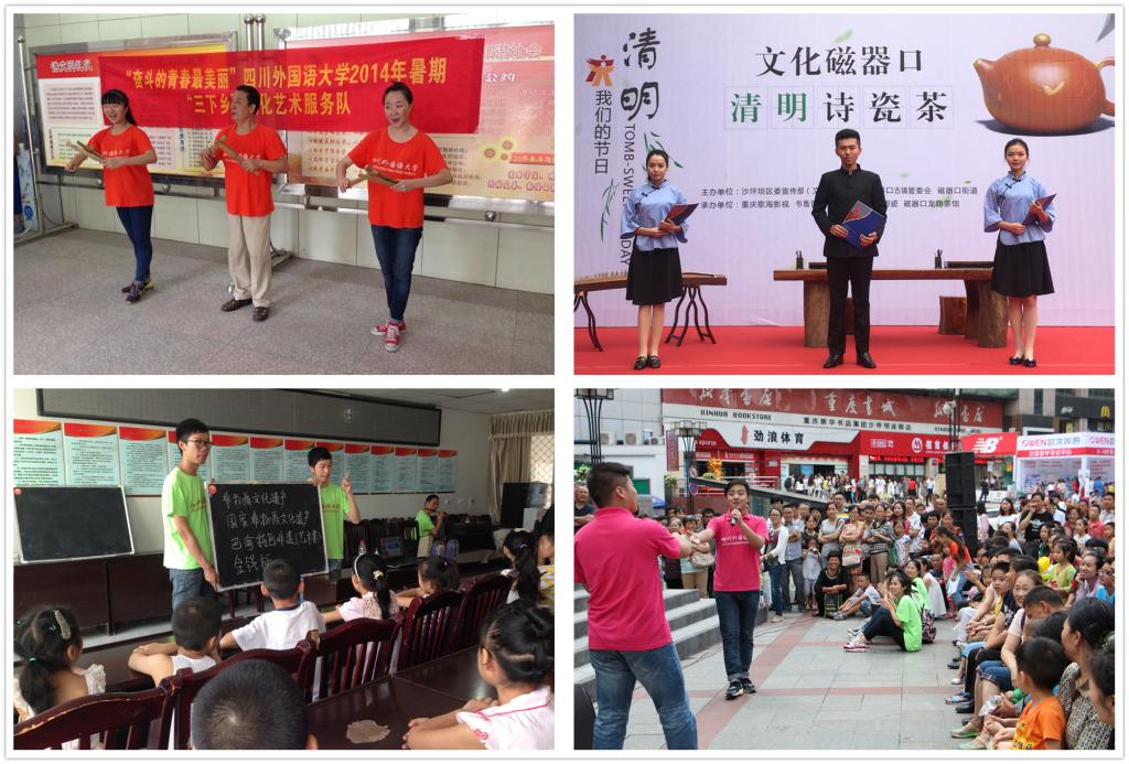 构建社会大众互动传播路径,让中华优秀传统文化的体验“火”起来。每年寒暑假精心筹划、组建师生“三下乡”专门队伍送文化下乡、送文化上门,将金钱板等传统文化艺术作品带到非遗项目丰富聚集地大凉山、重庆库区移民区县、主城周边区县,突出思想内涵,彰显价值观念,展现传统文化独特魅力。学校“三下乡”团队评为2016年全国大中专学生志愿者暑期“三下乡”社会实践活动优秀团队。对接受众需求、引导受众需求,创设稳定文化情景普及传统文化,探索解决中华优秀传统文化传播“最后一公里”问题。与沙坪坝区覃家岗街道、三峡广场商圈、磁器口古镇管委会、烈士墓小学结对合作,定期组织队伍进社区、进教室设点教授金钱板、篆刻、剪纸、武术等传统文化项目。累计开展活动200余场,深受市民、学生和家长好评,得到重庆卫视、中新网等媒体报道。借助研究生支教团项目,在支教地开展金钱板教学和推广活动。