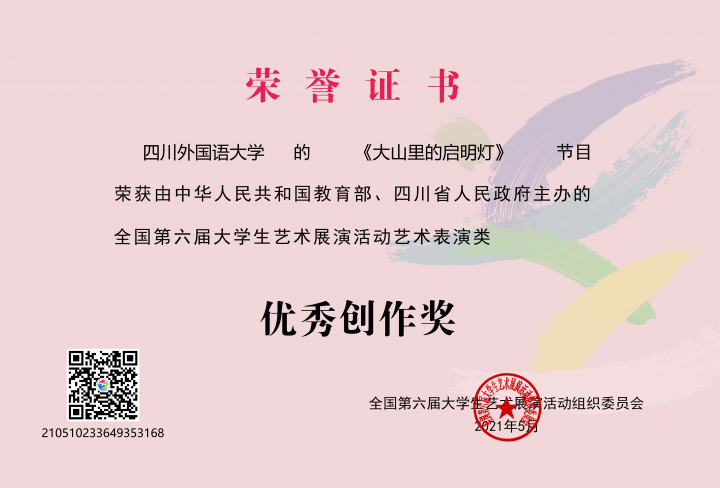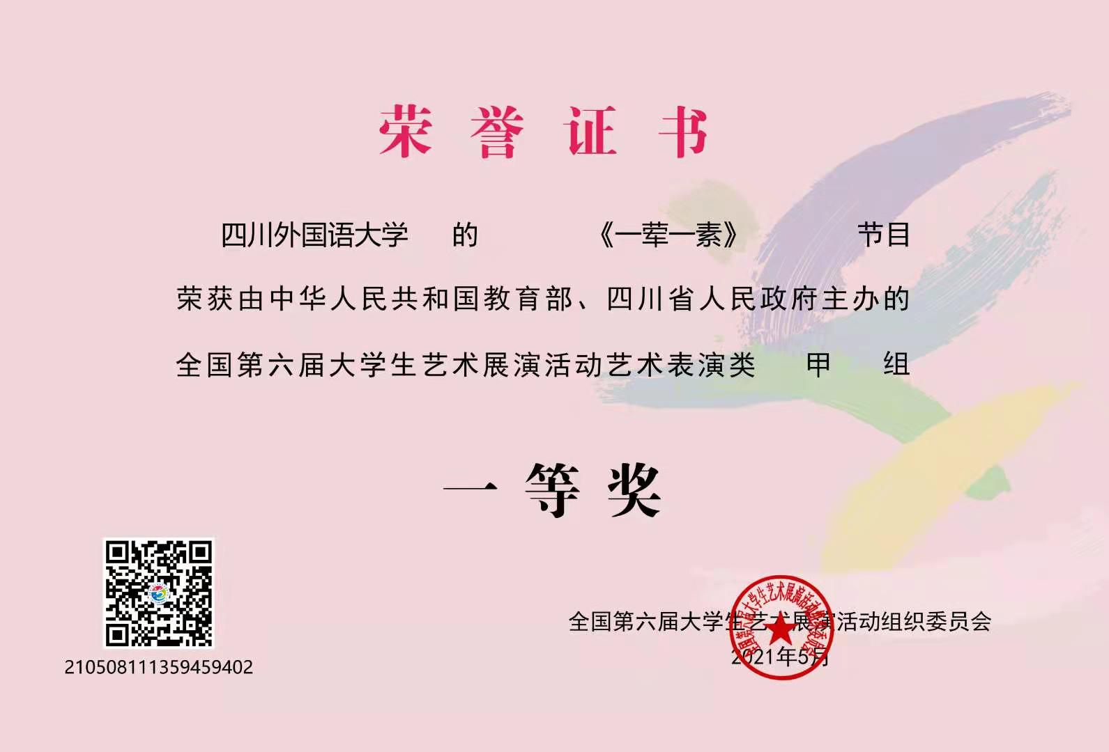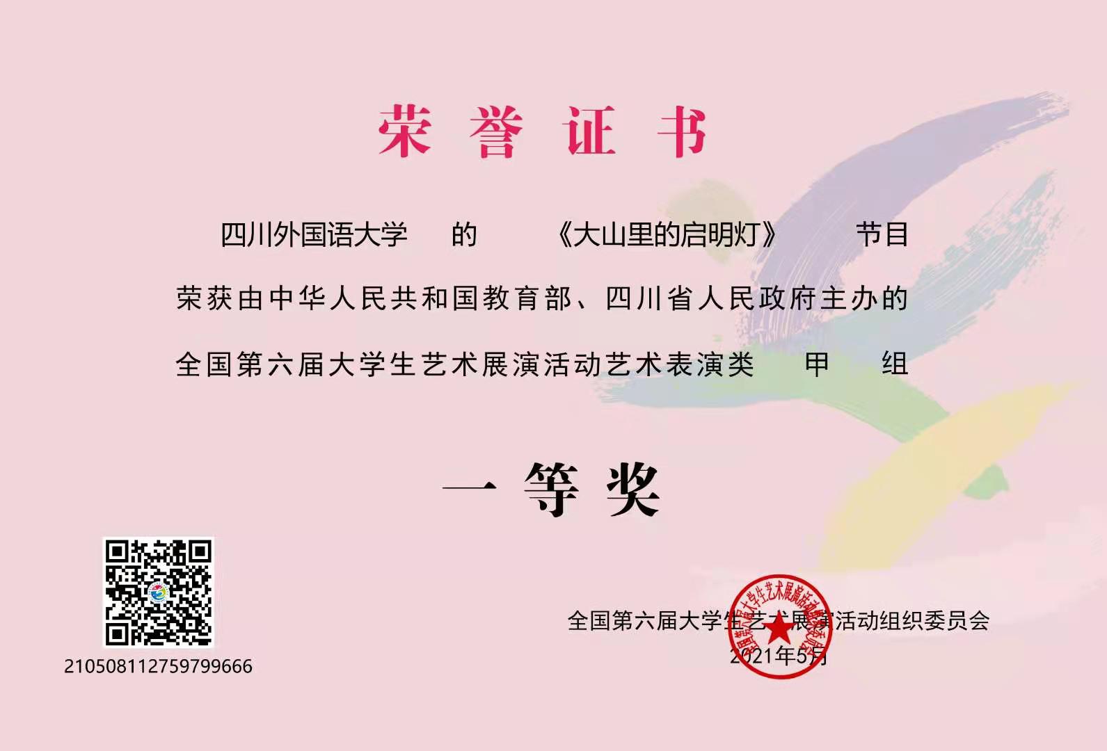 2021年5月6日至13日,由重庆市教委选送的我校声乐类作品小合唱《一荤一素》、戏剧类作品金钱板《大山里的启明灯》在教育部和四川省人民政府主办的全国第六届大学生艺术展演活动中双双荣获一等奖。其中,《大山里的启明灯》还荣获了艺术表演类优秀创作奖!这是我校自参与该项赛事以来取得的最佳成绩。我校节目总导演、编剧、编曲、国际教育学院党总支书记丁欢老师,执行导演、校大学生艺术团团长张永晖老师带队参赛。