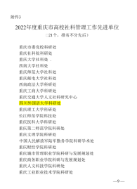 2022年,我校科研处在学校党委领导下,深入推进人文社科竞争能力建设,充分激发人文社科研究工作活力,获批国家社科基金重大项目1项,获批国家社科基金年度项目11项,国家社科基金中华学术外译项目2项,国家社科基金后期资助项目2项;获重庆市第十一次社会科学优秀成果奖10项,其中一等奖2项,二等奖1项,三等奖7项;区域国别研究院入选重庆市第四批人文社会科学重点研究基地。此次表彰充分肯定了我校取得的突出成绩,也是对我校未来社科工作的鼓励和鞭策。