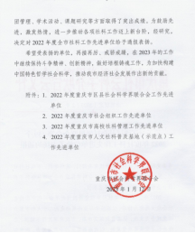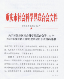 近日,重庆市社会科学界联合会下发《关于对江津区社科联等159个2022年度社科工作先进单位给予表扬的通报》(渝社联发〔2023〕2号),对2022年度全市社科工作先进单位给予通报表扬。我校科研处荣获“2022年度重庆市高校社科管理工作先进单位”称号。