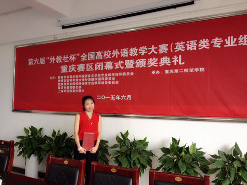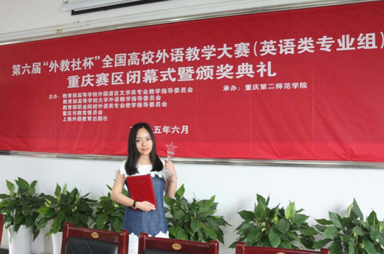 第六届“外教社杯”全国高校外语教学大赛(英语专业组)重庆赛区的复赛与决赛于6月6日、7日在重庆第二师范学院圆满结束。我校选派了翻译学院的黄钰洁和商务英语学院的甘姝姝两名老师参加了此次比赛,分获英语专业组特等奖和商务英语专业组一等奖。