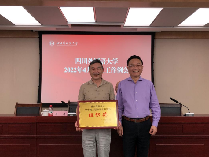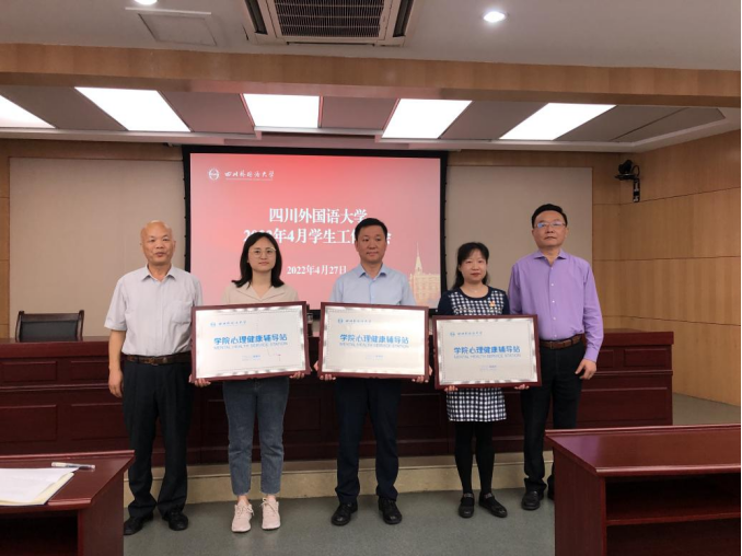 会议第一阶段,崔光军通报了学校2021年“读懂中国”活动、2021年“中华魂”主题教育读书活动获奖情况;宣读了学校获得2021年度市级文明寝室名单和《四川外国语大学关于设立“二级学院心理辅导站”的决定》。与会领导分别为获奖集体和个人颁奖,为“二级学院心理健康辅导站”授牌。