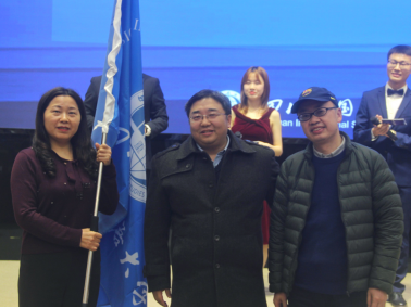 最后进行的是大赛主办学院的校旗交接仪式。校旗从国际关系学院刘玉梅院长手中交到明年的承办单位翻译学院胡安江院长手中。
