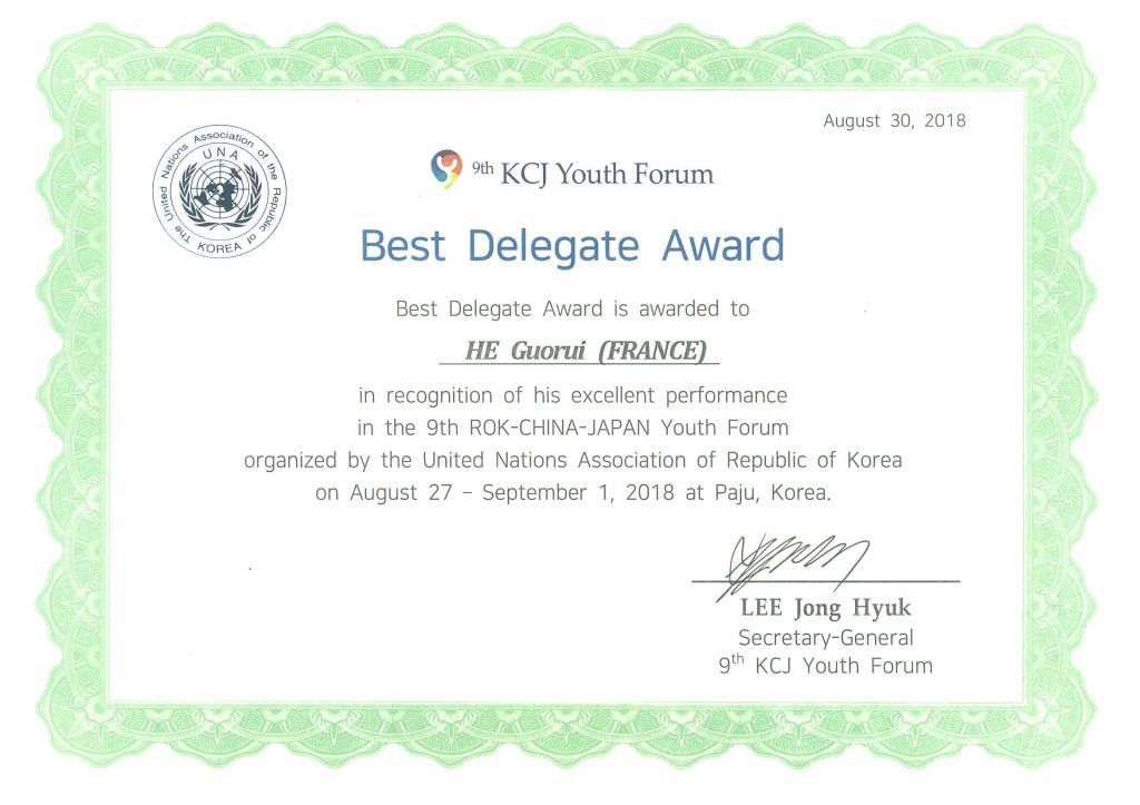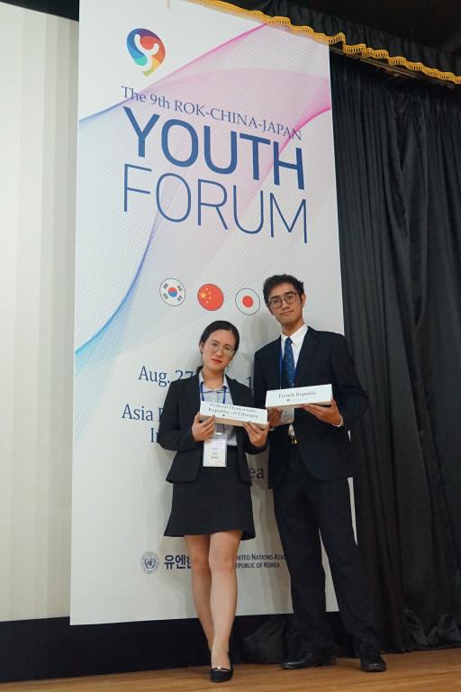 由韩国联合国协会(UNA-ROK)举办、中国联合国协会、日本联合国协会支持的第九届中日韩青年论坛(The 9th ROK-CHINA-JAPAN Youth Forum)于2018年8月27日-9月1日在韩国坡州(Paju)举办。我校共派出国际关系学院贾思梅、何国锐两名学生代表参加。何国锐同学最终斩获最佳代表奖。