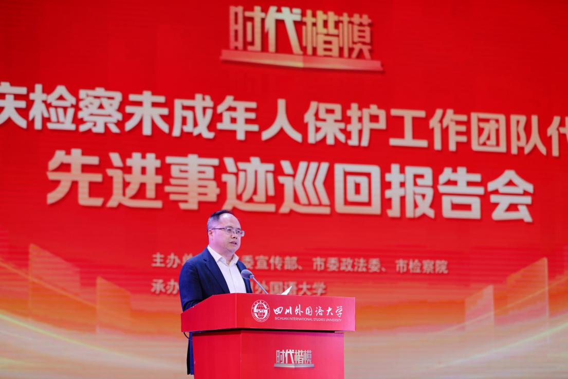 严功军在致辞中指出,渝检护“未”团队用坚守践行使命、用大爱守护未来,是开展思政教育、法治教育的鲜活教材和生动范本,也是践行立德树人根本任务的精神标杆和行动楷模。此次报告会学校同步组织附属小学、附属中学、大学三个学段师生代表共同参会,是川外推进大中小学思政教育一体化建设的重要实践探索,旨在让法治精神在不同年龄段学生心中生根发芽,实现思政教育的纵向贯通与横向融合。他希望全体师生以此次报告会为契机,深刻感悟楷模精神的时代内涵,将法治信仰内化于心、外化于行,争做尊法学法守法用法的时代新人。