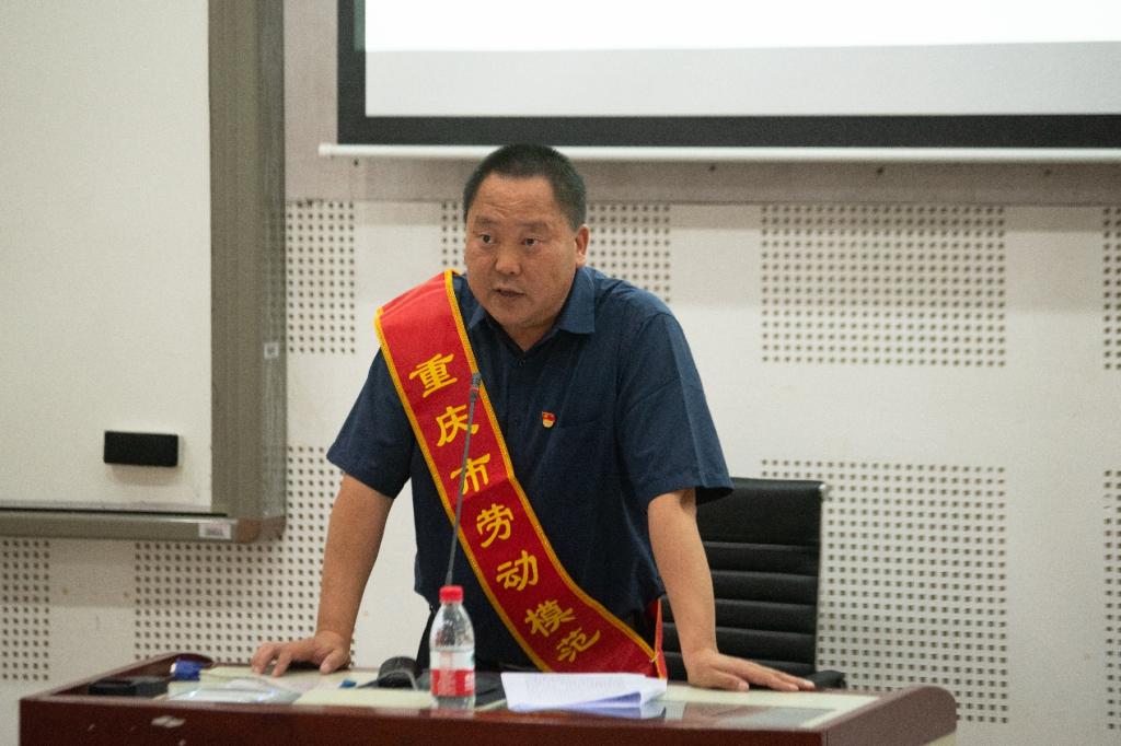 活动现场,重庆市劳动模范张毅发言,他讲述了自己在工作岗位上的劳动经历,一直兢兢业业、勤勤恳恳,任劳任怨,展现了一个教育工作者无私奉献的精神。“劳力劳心,亦知亦行”、“纸上得来终觉浅,绝知此事要躬行”,他认为要把劳动精神的宣传同深入学习党的二十大精神结合起来,同贯彻落实全国高校思想政治工作会议精神结合起来,把开展劳动教育与进行社会主义核心价值观教育结合起来,引导当代青年学生坚定信念、夯实政治素养,努力学习、练就过硬本领,锤炼品格。他指出,劳动精神本身就是一种实践哲学,其最大的意义存在于实践之中,内化于心,外化于行,将其融入课堂教学和社会实践的具体环节之中,就是要在平凡岗位上践行劳动理念。最后,他希望大学生应该要树立科学劳动观,从而促进自身发展,促进国家和民族的进步。